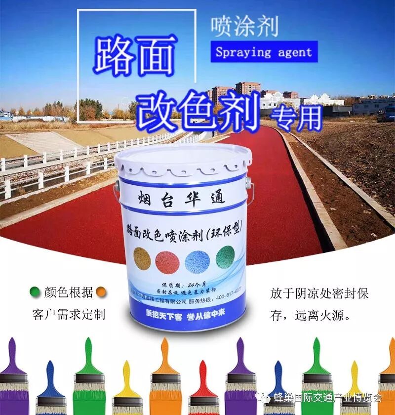 彩色路面专用喷涂剂(油性)是烟台华通公司自主研发的聚氨酯复合材料彩色路面改色剂,可以对水泥、沥青混凝土道路及各种人行道板等路面进行任何颜色的改色美化。相比彩色防滑铺装,施工工艺简单,成本低,封层颜色更加鲜艳、靓丽、持久,与原面层的粘附性更好,强度、耐候性、耐磨性更佳。